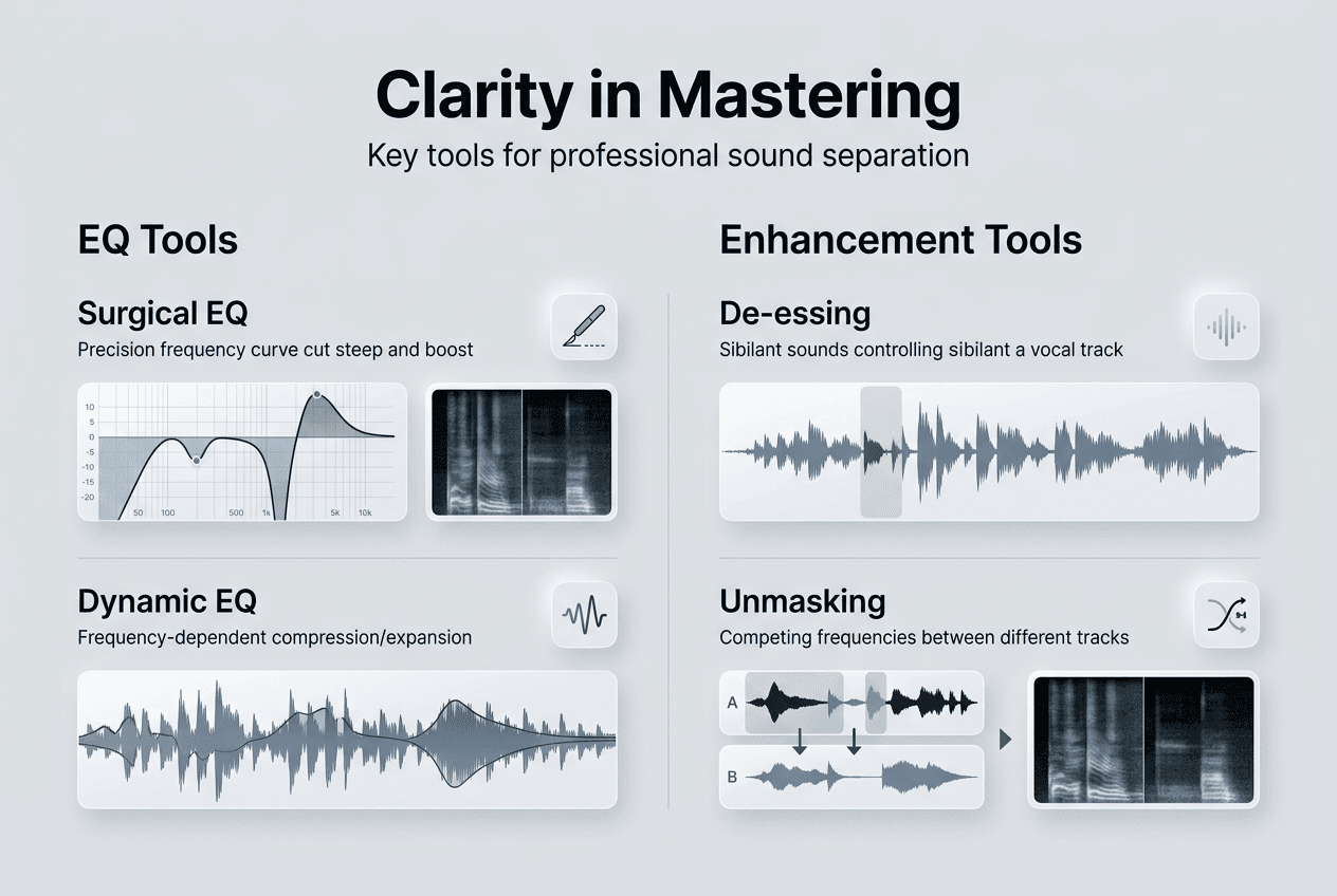 Clarity problems often hide in specific frequency ranges that need surgical attention. Use surgical EQ for resonances and tonal EQ for balance, starting with narrow cuts to fix mud or harshness. Surgical EQ uses high Q values (narrow bandwidth) to target problem frequencies without affecting surrounding areas. This precision prevents the over-EQing that makes masters sound thin or unnatural.