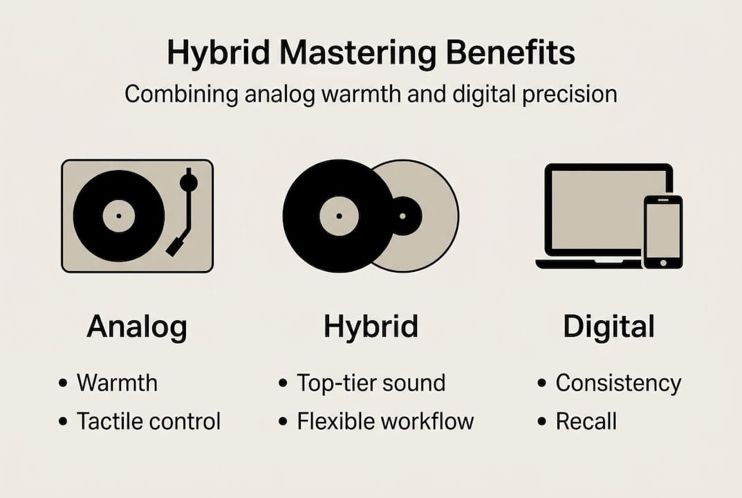 Hybrid mastering addresses both of those limitations directly. As noted in the Abbey Road Institute's guide, hybrid approaches combine analog's musicality and digital precision, balancing the strengths and weaknesses of each. The key benefits for artists and labels include: